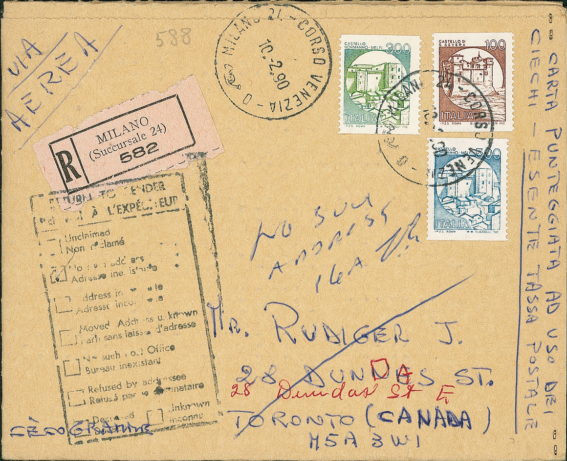 REPUBBLICA - Braille - raccomandata aerea da Milano a Toronto del 10.2.90...