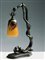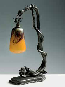Daum. Lampada da tavolo con diffusore in pasta di vetro arancione e sfumature marroni; fusto in ferro battuto a forma di serpente, 1900 circa. Firma incisa: Daum Nancy France altezza cm 44