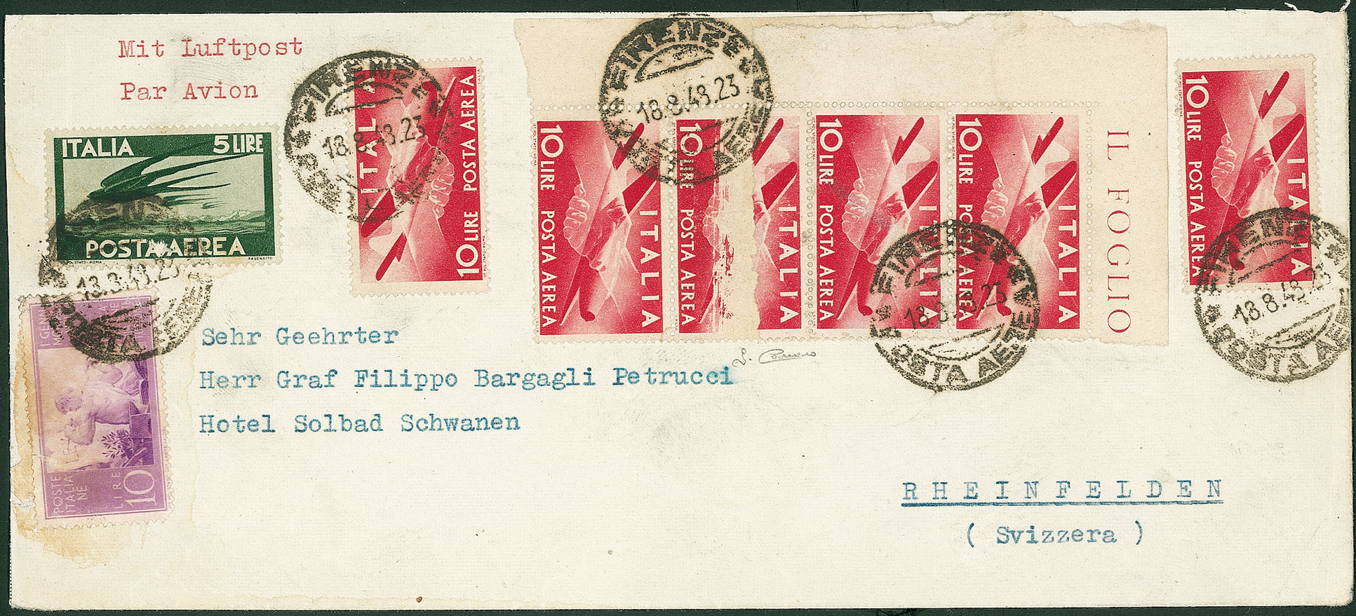 REPUBBLICA - 10 lire Aereo - striscia di quattro con i due centrali su carta ricongiunta - aerogramma con affrancatura multipla da Firenze per la Svizzera del 18.8.48 - tre lettere conosciute - cert. Carraro (130b Aerea + complementari)