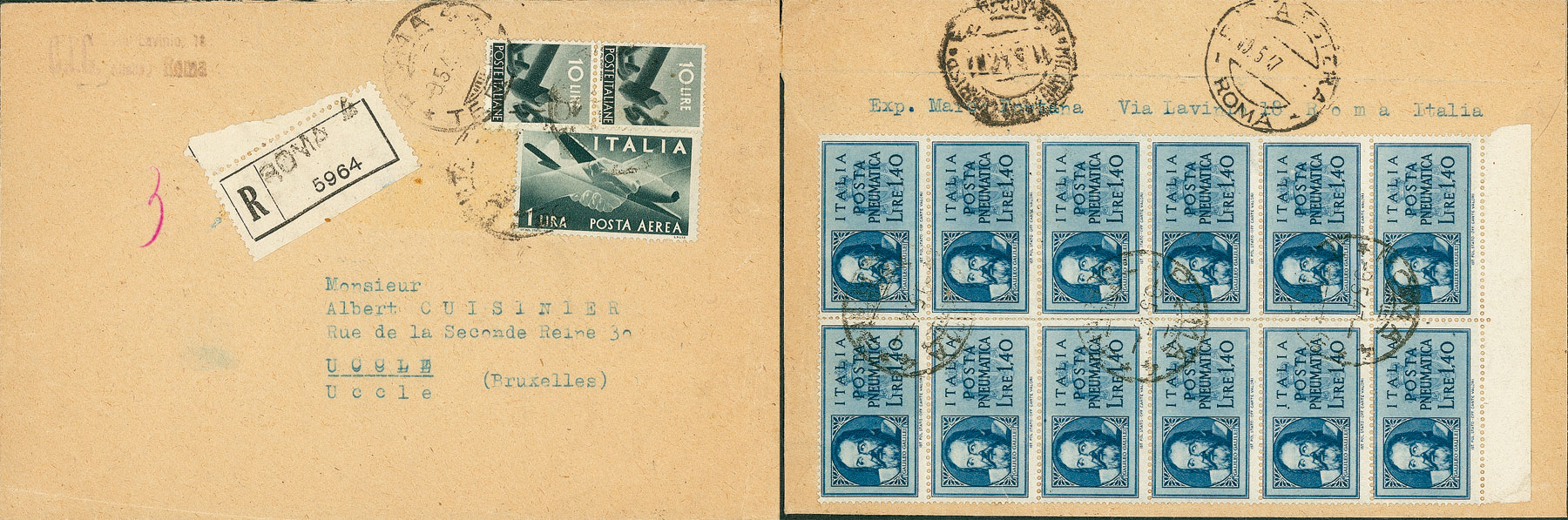 REPUBBLICA - Blocco di dodici del 1,40 lire + complementari - raccomandata da Roma a Bruxelles del 9.5.47 (17 Posta Pneumatica + 558 + 126 Aerea)