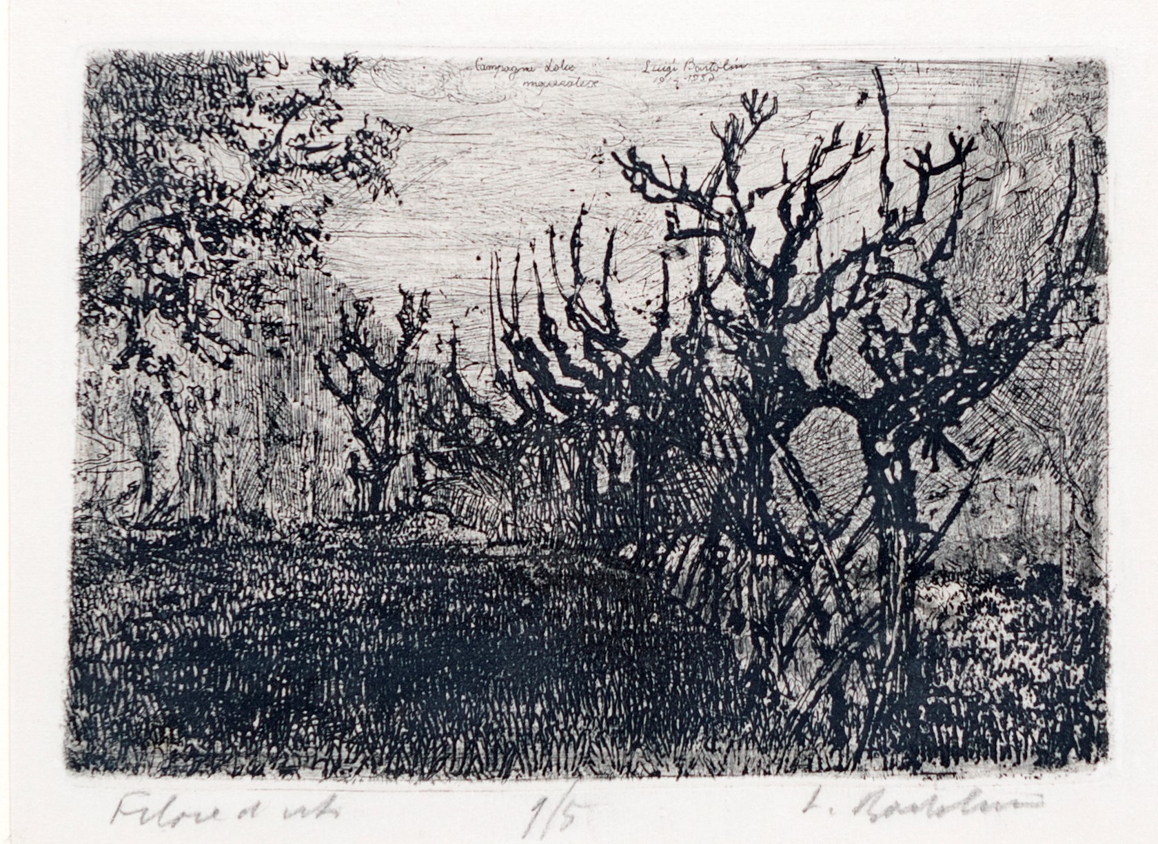 Firma e numerazione sul fronte a matita "L.Bartolini 1/5". In alto incisa in lastra titolo, firma e data
