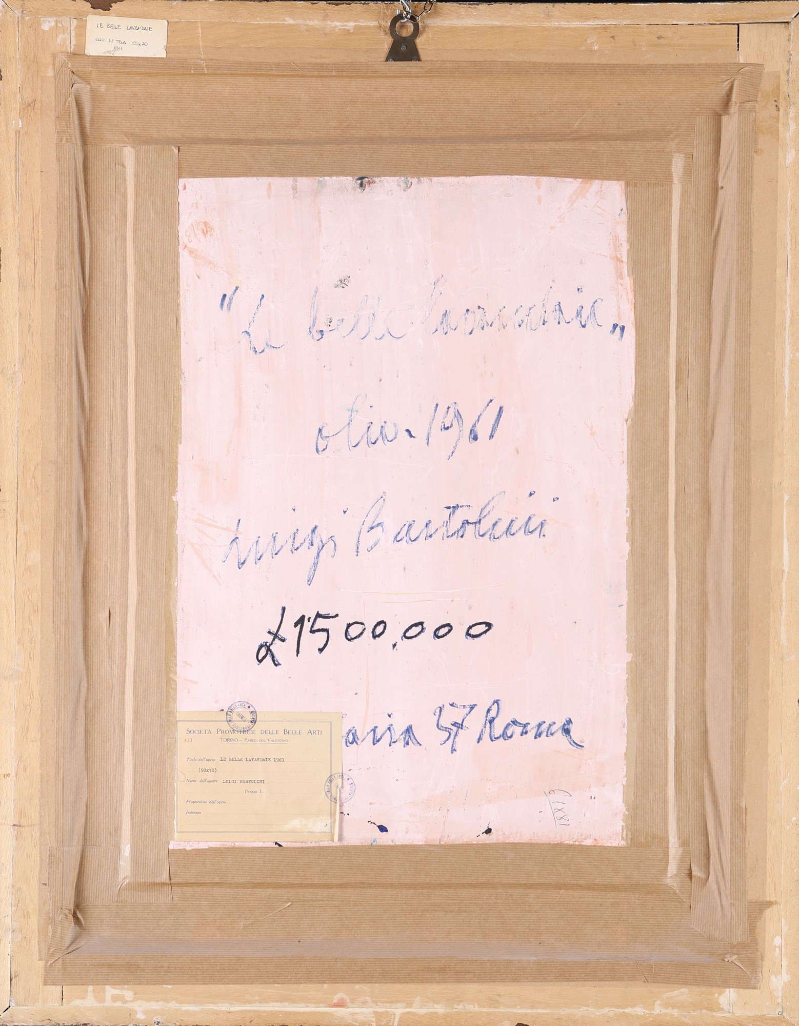 Firma "Bartolini" sul fronte in alto a destra. Al verso reca titolo, anno e firma. Etichetta della Società Promotrice delle Belle Arti, Torino - Parco Valentino.