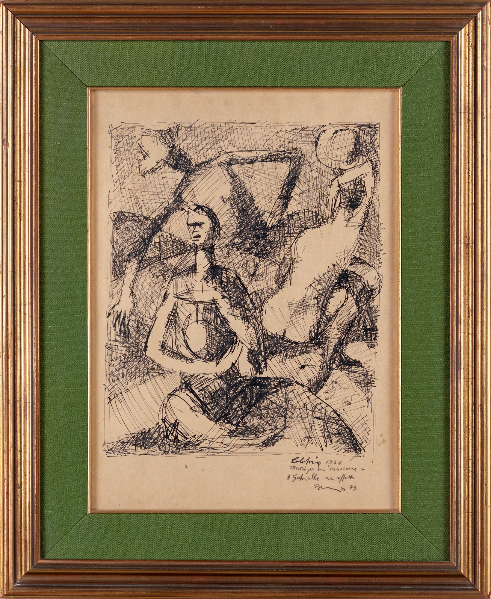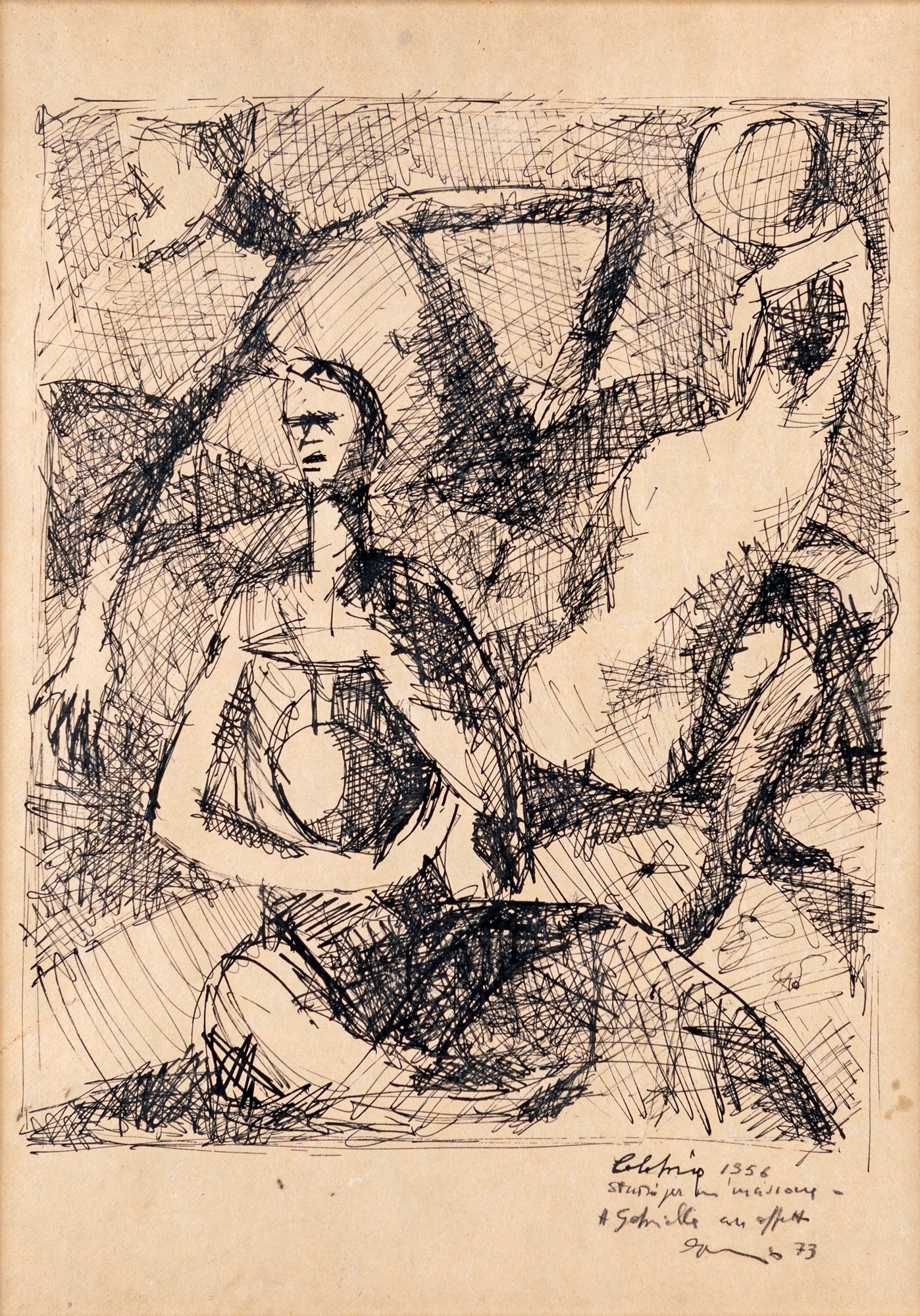 Firma, data, titolo e dedica sul fronte "Calabria 1956, Studio per un incisione, A Gabriella con affetto, Calabria '73".