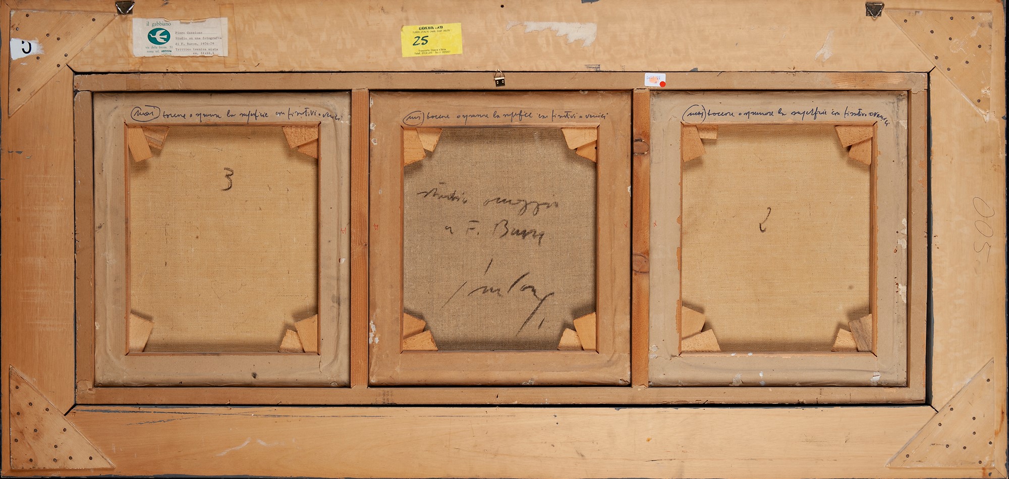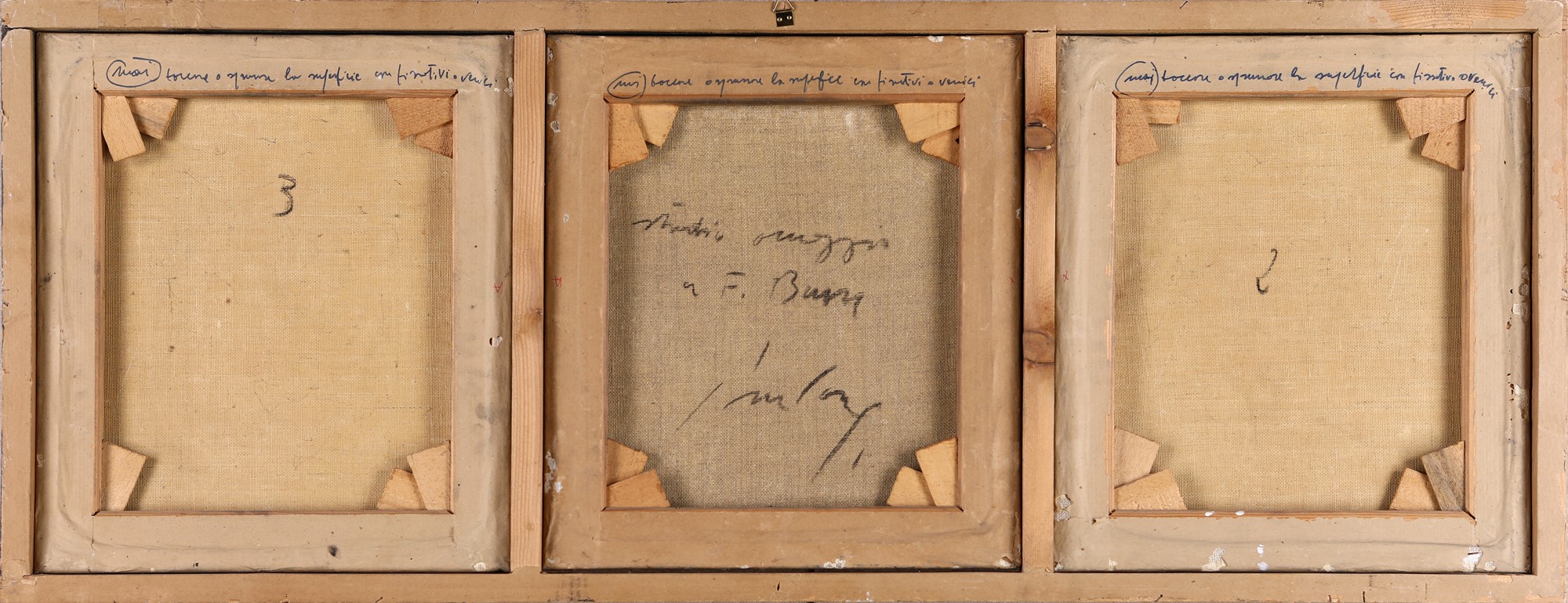La firma ed il titolo "Omaggio a F. Bacon, Piero Guccione" sono apposte al retro del dipinto centrale.