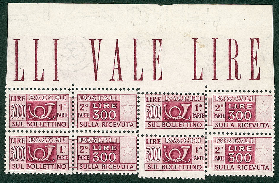 REPUBBLICA - 1948 - 300 lire - quartina bordo foglio - parte destra con dentellatura orizzontale spostata in basso nelle sezioni di sinistra - gomma integra (79 Pacchi Postali - 7.500++)
