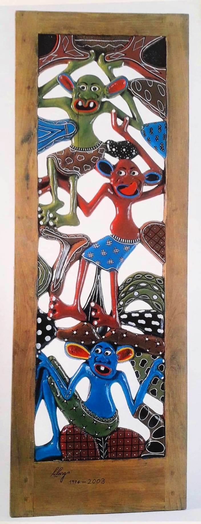 LILANGA GEORGE Tanzania 1934-2005 ”The door of dar” smalti e acrilici su legno intarsiato e sagomato cm 203x72x4 del 1974-2003. Firmato e datato sul fronte in basso a sinistra. Opera pubblicata a pag 141del catalogo ragionato “George Lilanga” Volume II. Provenienza collezione privata.