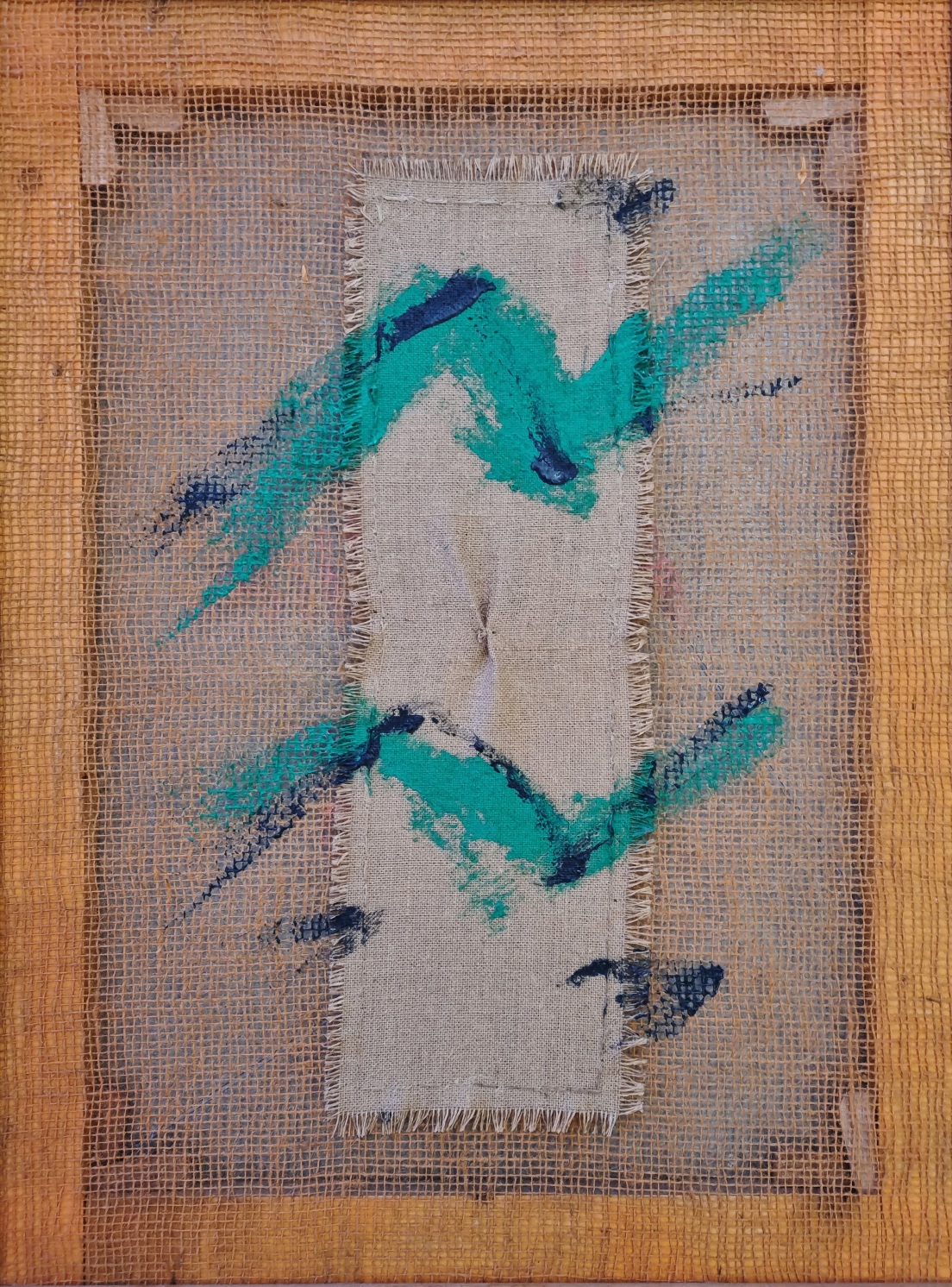 EMBLEMA SALVATORE Napoli 1929-2005 "Senza titolo” terre colorate e cuciture su tela di juta cm 80x60 del 2005. Sul retro firmato, datato, numero d’archivio e timbro del Museo Emblema. Autentica ed archiviazione su foto a cura del Museo Emblema.