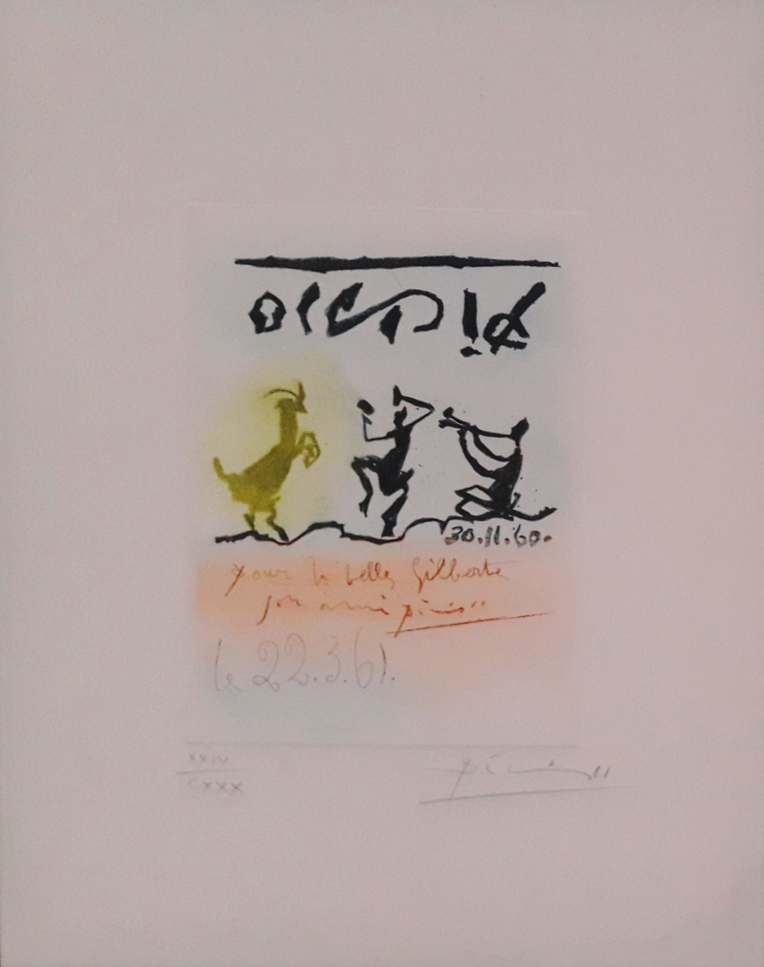 PICASSO PABLO Malaga 1881-Mougins 1973 “Senza titolo” incisione ed acquerello su cartoncino cm 12x18 del 1960. Firmato sul fronte in basso a destra,numerato XXIV/CXXX in basso a sinistra. Al centro data e dedica ad personam.
