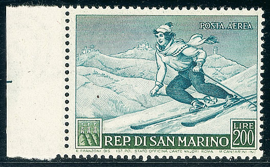 SAN MARINO - 1953 - 200 lire Sciatrice - gomma integra (111 Aerea - 115)