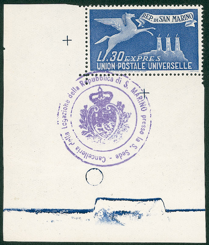 SAN MARINO - 1946 - 30 lire - angolo di foglio non tosato con timbro della Cancelleria - gomma integra (15 Espressi)