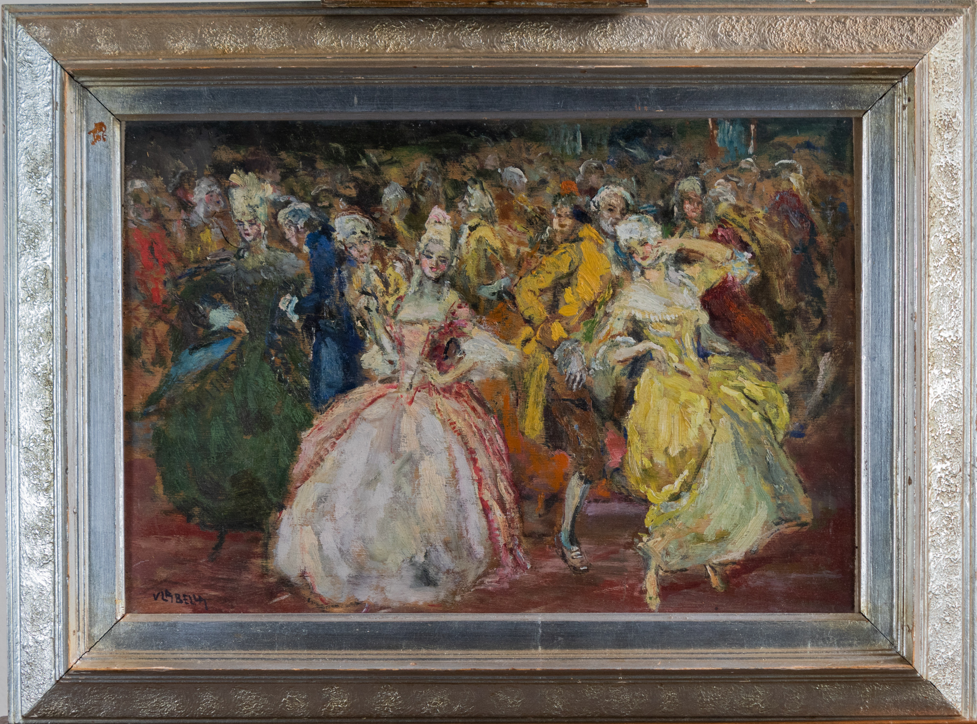 Vincenzo La Bella (Napoli 1872 - 1954), ballo veneziano, olio su tavola, 30x43 cm
