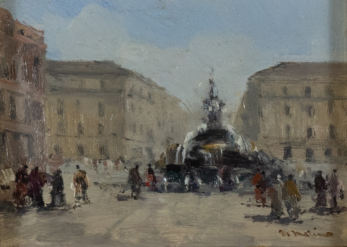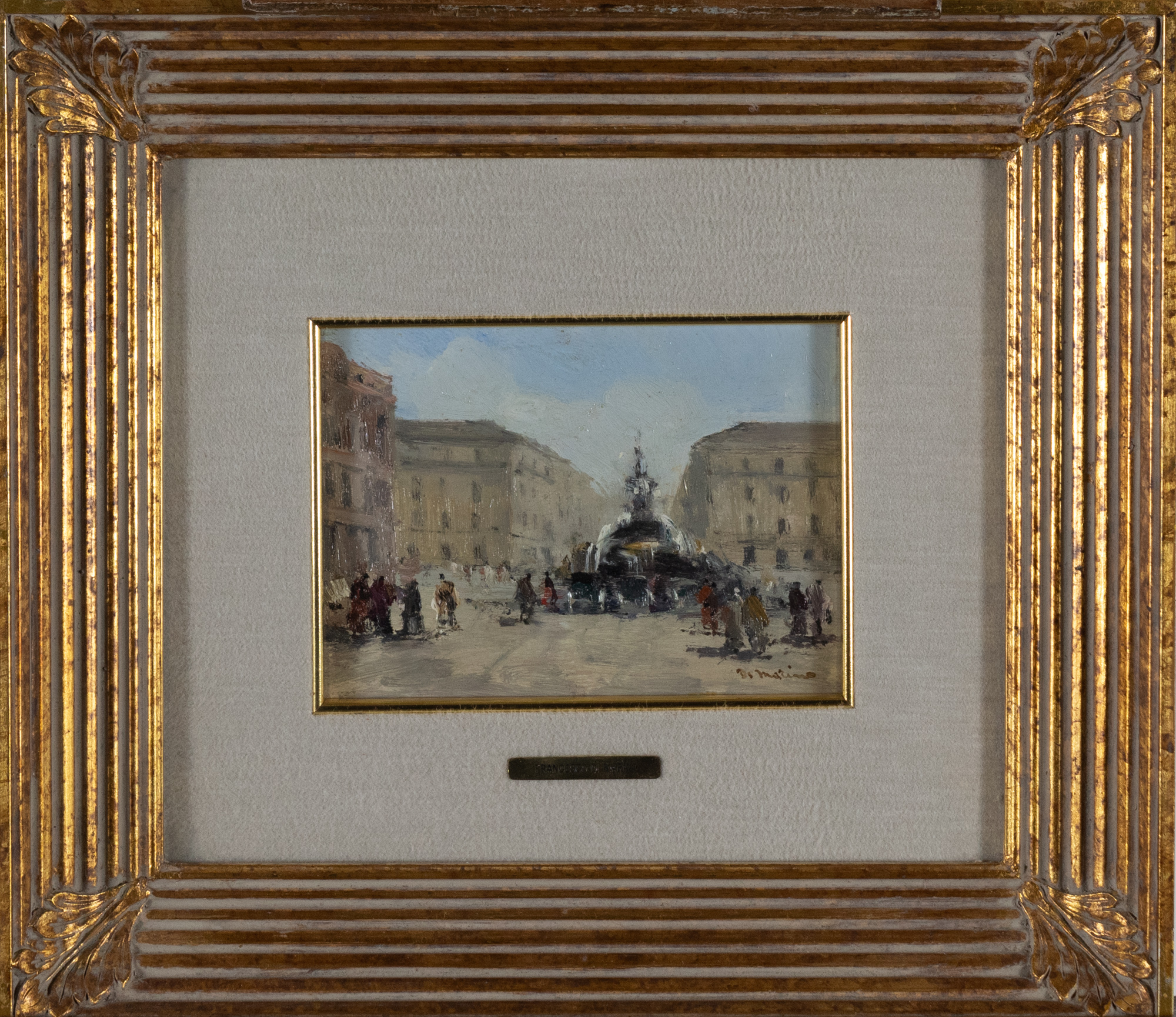 Francesco Di Marino (Napoli 1892 - 1954), Piazza Borsa, olio su tavola, 11x15 cm