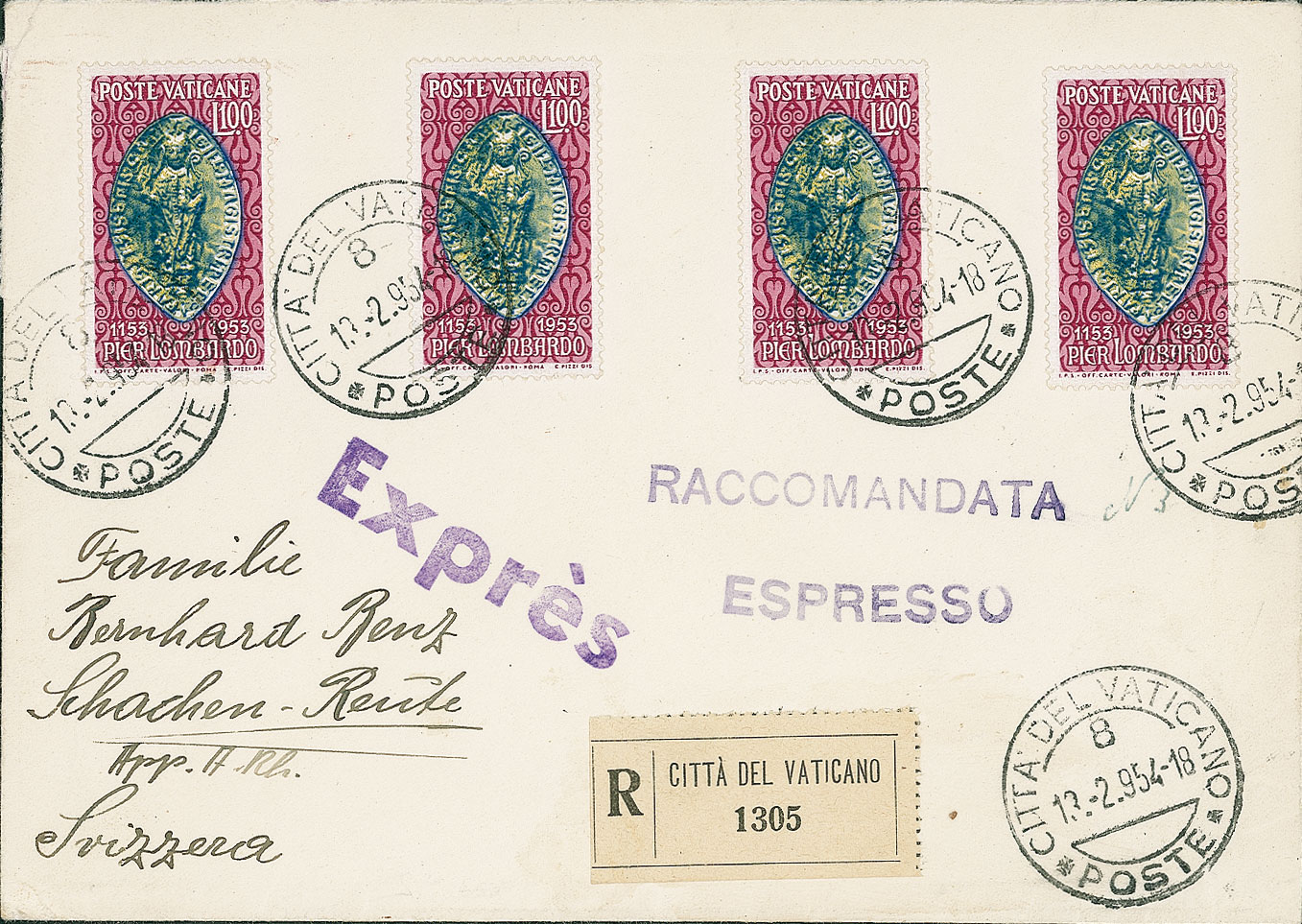 VATICANO - 100 lire Pier Lombardo - quattro pezzi su raccomandata espresso per la Svizzera del 13.2.54 (173 - 1.000)