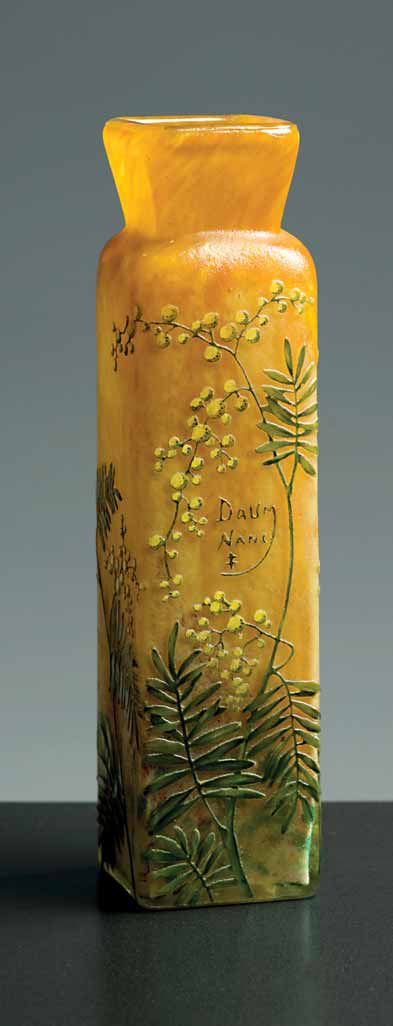 Daum. Vaso in vetro a cammeo e smalti con corpo rettangolare e decoro a mimose su fondo arancione, 1900 circa. Firma a cammeo: Daum Nancy altezza cm 21