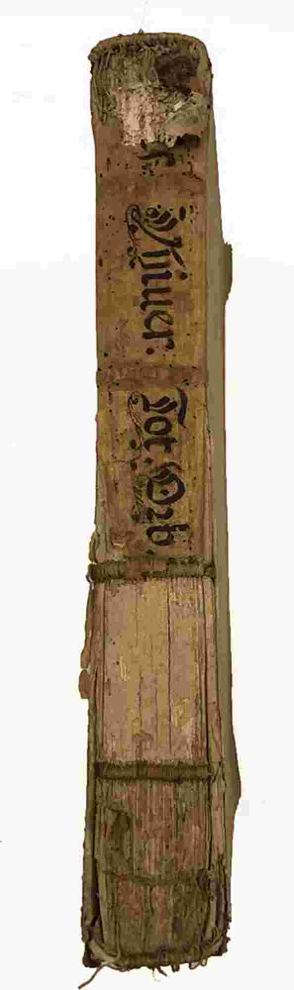 Contemporary hard vellum, 6-rib spine with handwritten title, damaged. Some slight water stains on a few pages. Overall good copy.
