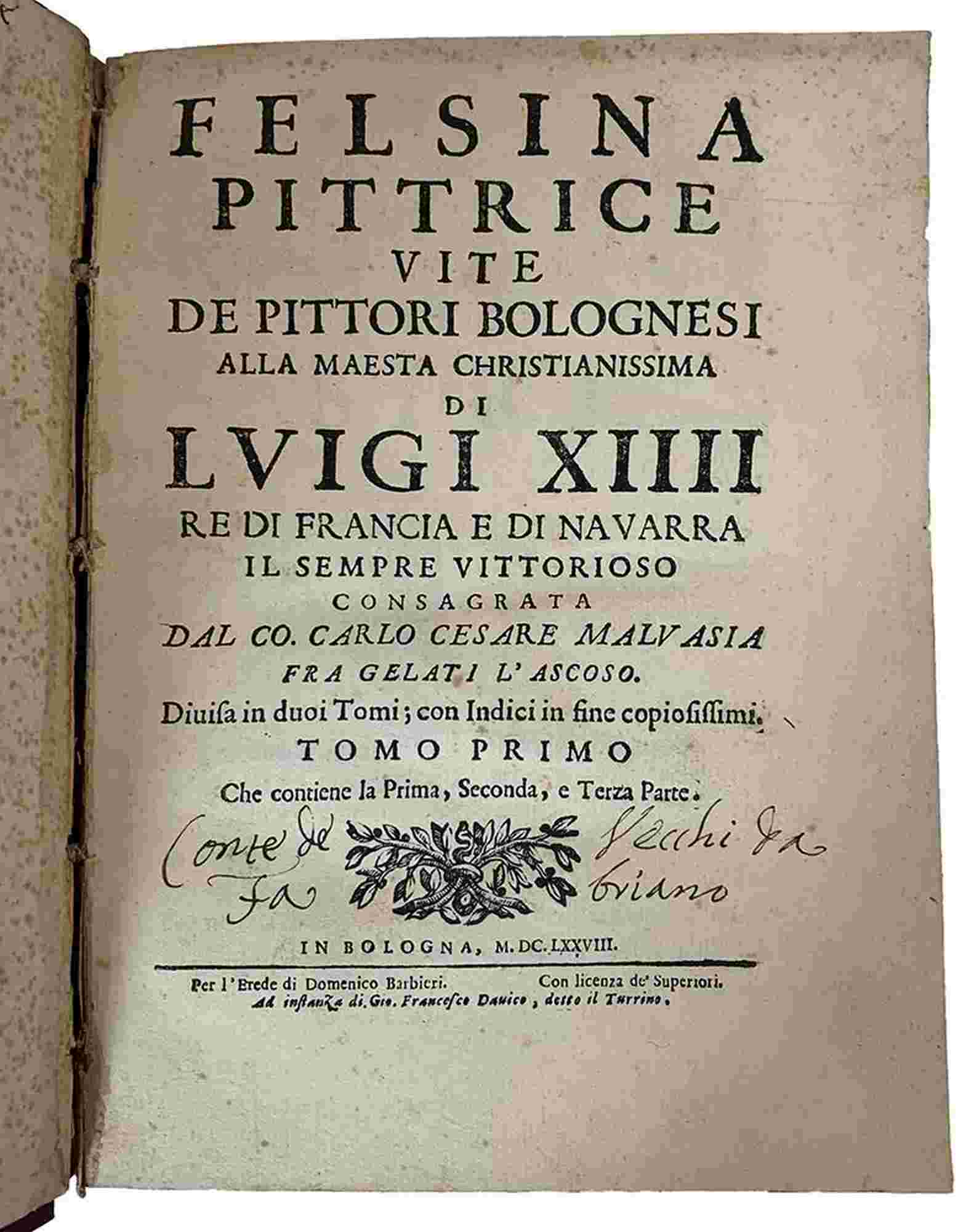 CARLO CESARE MALVASIA: Felsina Pittrice, Bologna, Eredi Domenico Barbieri, 1678