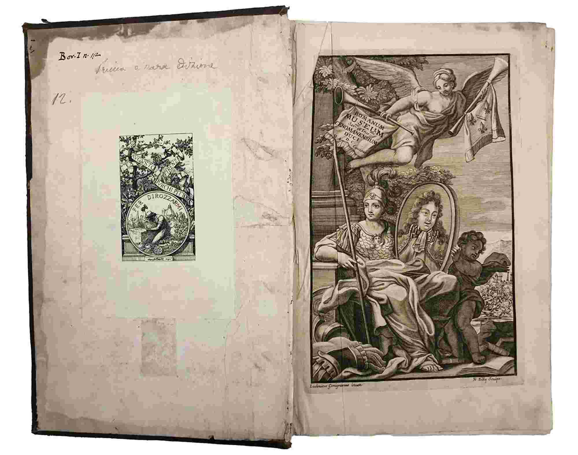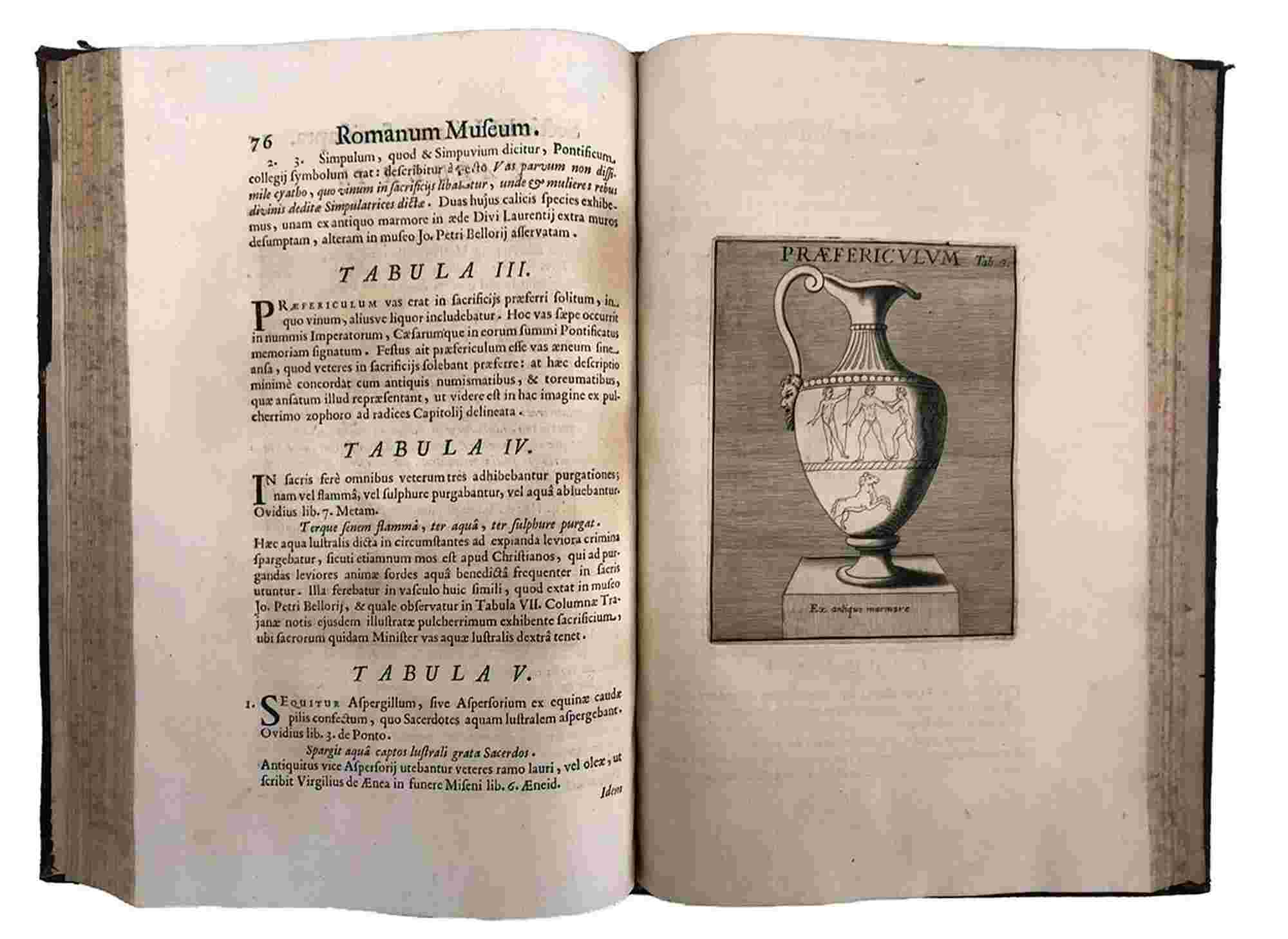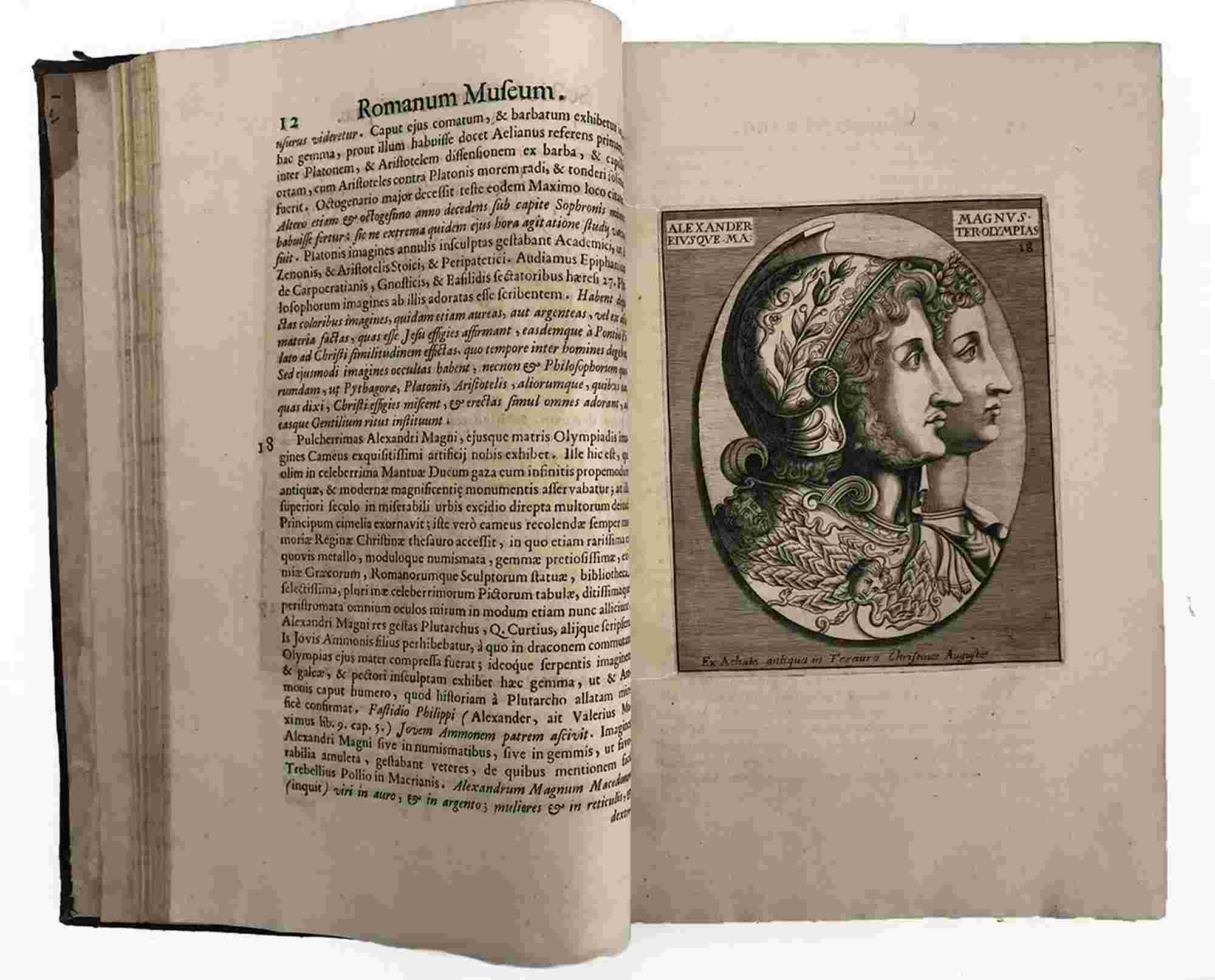 Contemporary five-rib calf, with gilded ornaments on the spine, damaged. The volume is complete with all engraved plates depicting the artefacts of Roman museums. Very good copy except for the plate 1 after the page 124 marked with the blue pen.