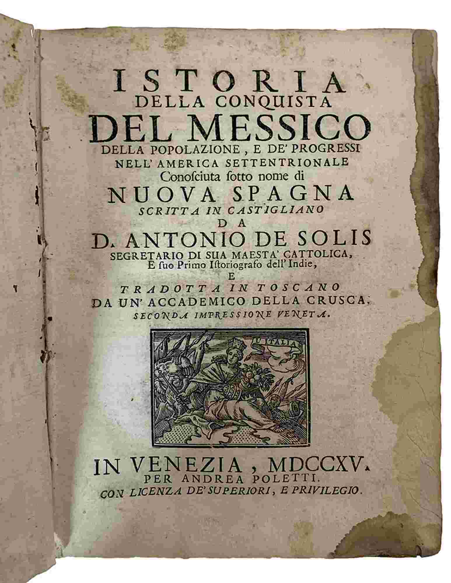 ANTONIUS DE SOLIS: Istoria Delle Conquista Del Messico, Venezia, Andrea Poletti, 1715