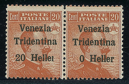OCCUPAZIONI - 1918 - 20 heller su 20 cent - coppia - r rotta a sinistra + 2 mancante a destra - gomma integra (30da/30c - 360+)