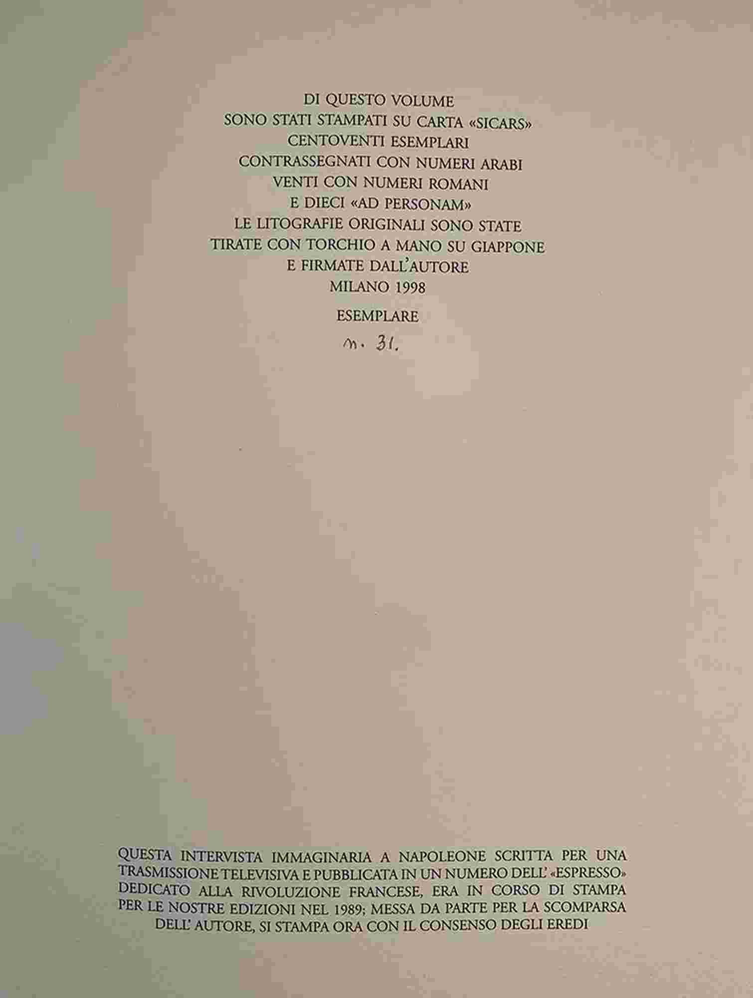 Edition printed on Sicars paper in 150 numbered copies, 120 of which in Arabic numerals.