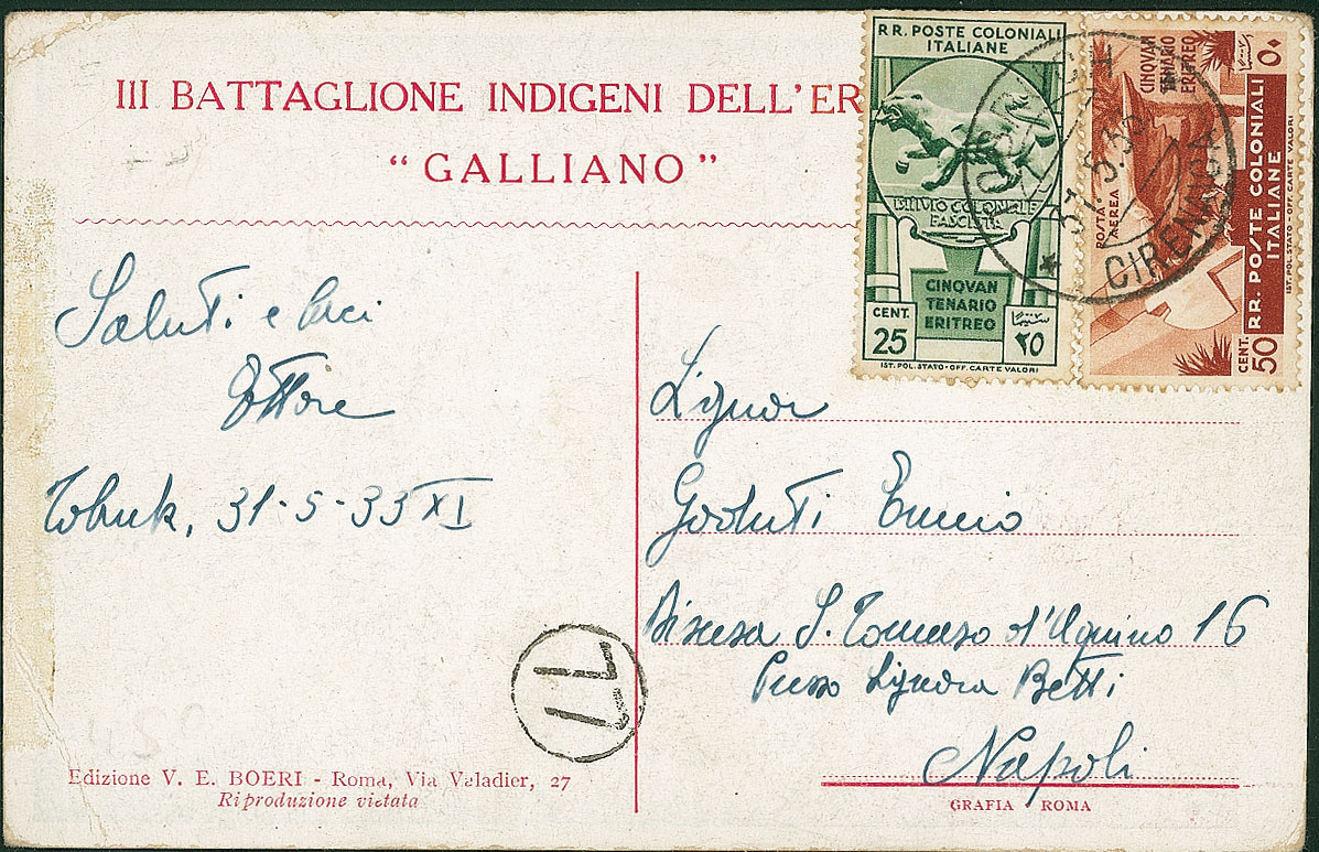 COLONIE E POSSEDIMENTI - Emissioni Generali - 25 cent + 50 cent - cartolina da Tobruck a Napoli del 31.3.33 (25+15 Aerea - 450)