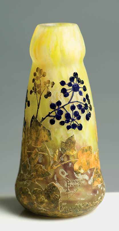 Daum. Vaso in vetro a cammeo con motivo a bacche in blu e arancio su fondo giallo, 1900 circa. Firma a cammeo: Daum Nancy altezza cm 30