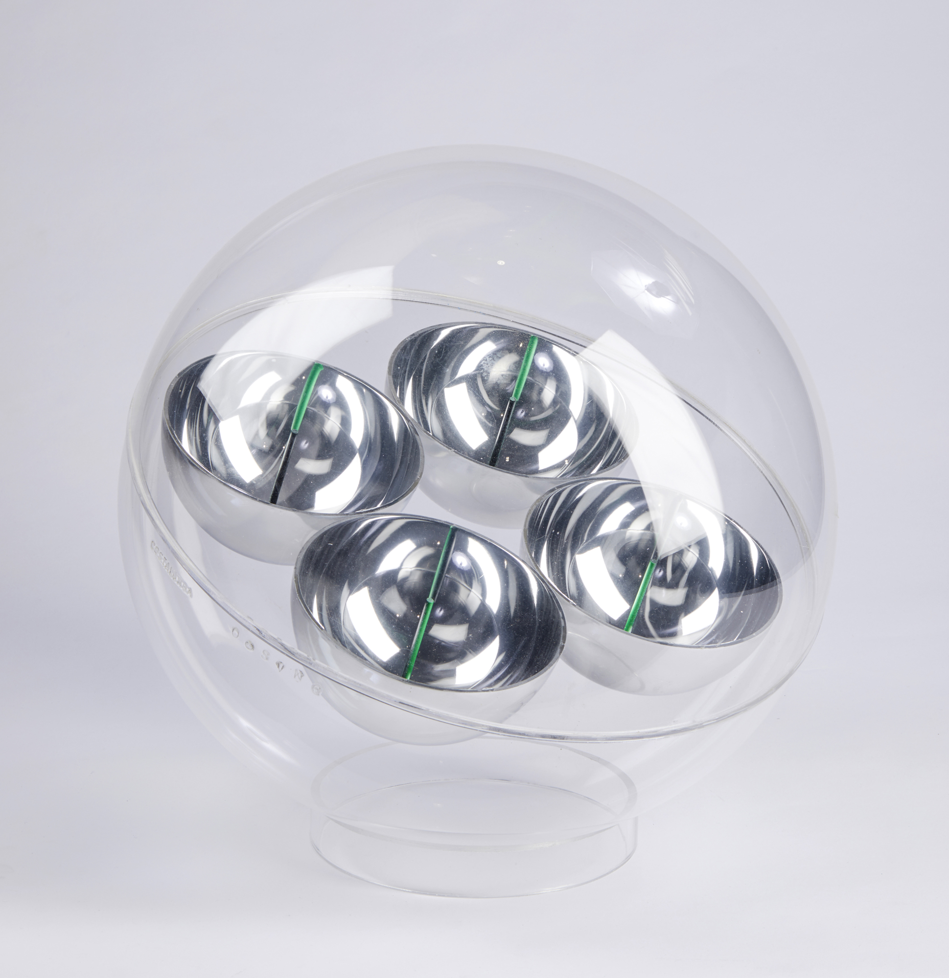 Quattro semisfere cromate entro sfera in plexiglas, diametro cm. 40