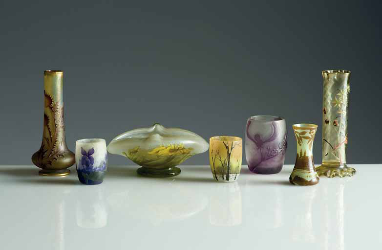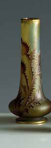 Daum. Piccolo vaso in vetro a cammeo e smalti con decoro a cardi, lungo collo cilindrico, 1900 circa. Firma in oro: Daum Nancy altezza cm 12,5