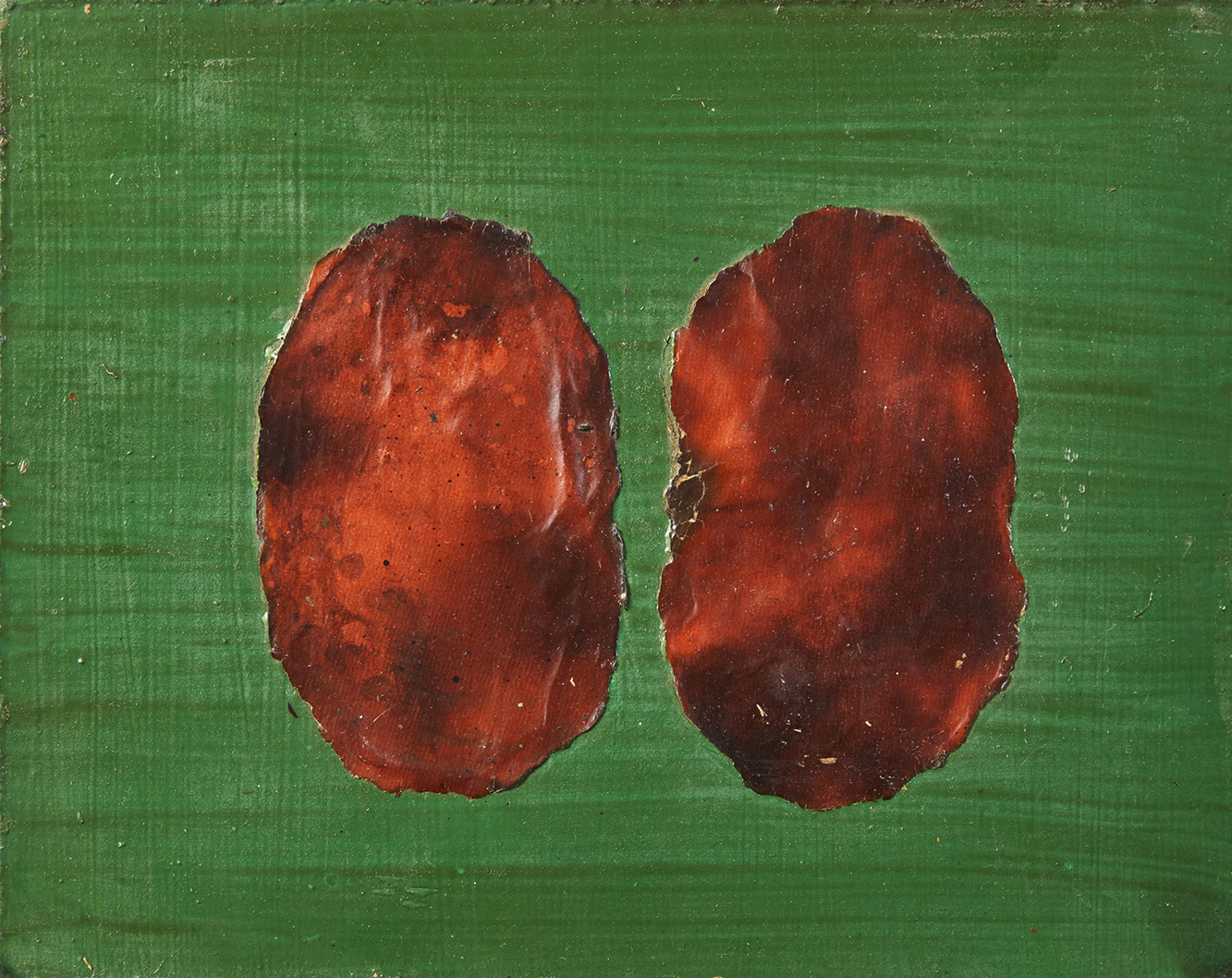 Collage di carta bruciata su tavola dipinta, cm. 19,5 x 25