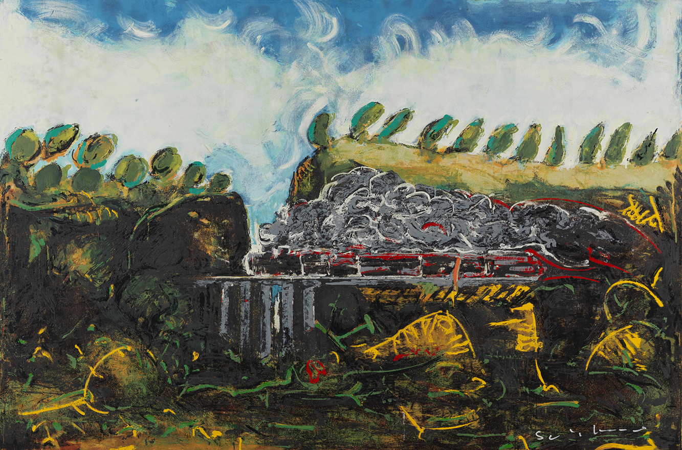 MARIO SCHIFANO Quadro severo con trenino allegro