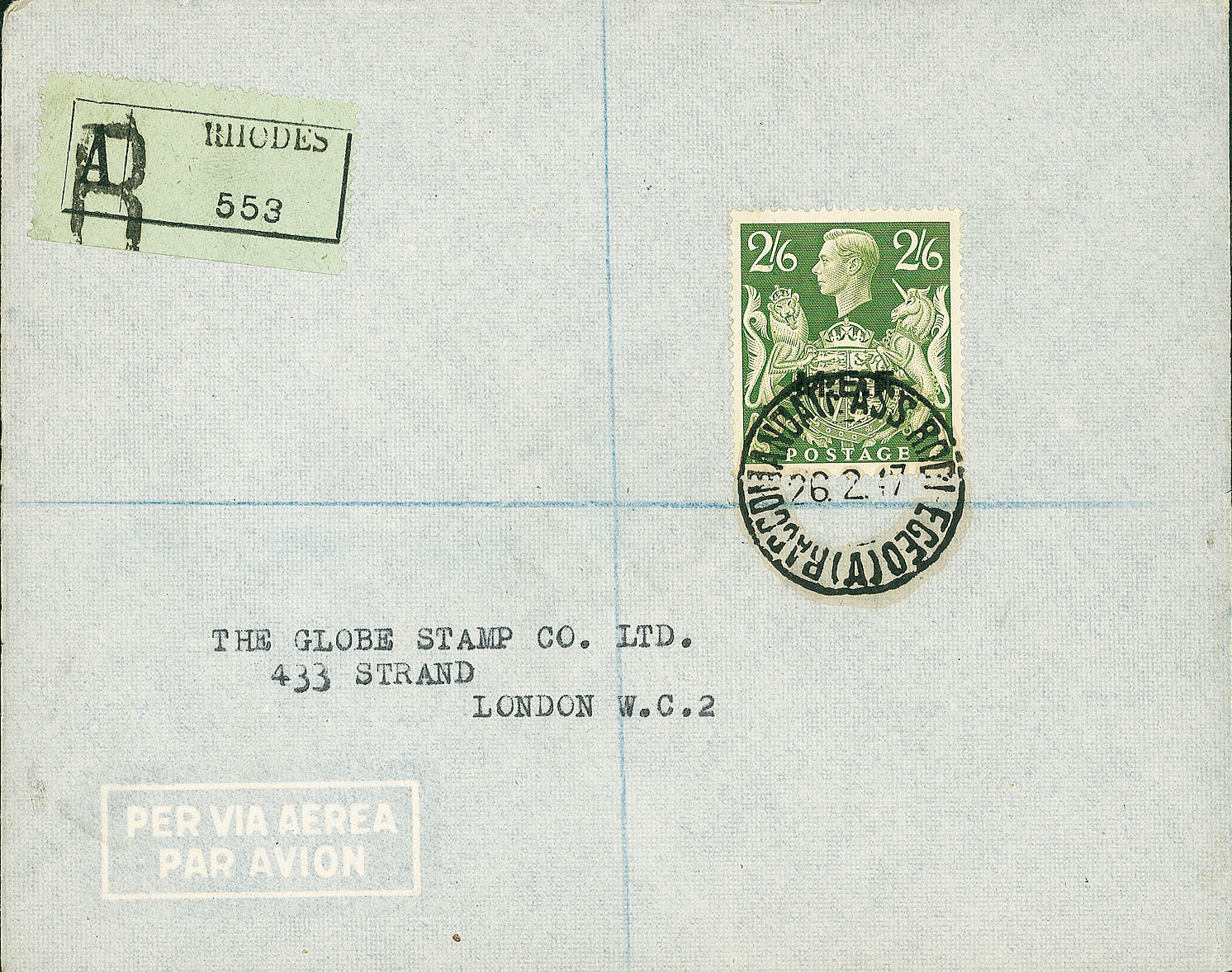 COLONIE OCCUPAZIONI STRANIERE - 2,6 scellini - isolato su raccomandata da Rodi a Londra del 26.2.17 (14)