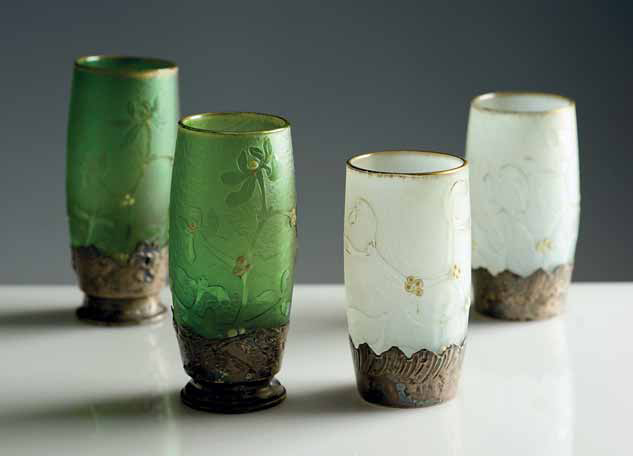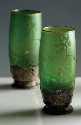Daum. Coppia di vasi in vetro a cammeo decorati in oro e smalti a motivi vegetali; base in argento sbalzato, 1900 circa. Firma a smalto in oro: Daum Nancy altezza cm 14,5