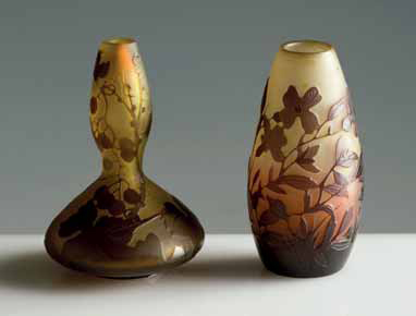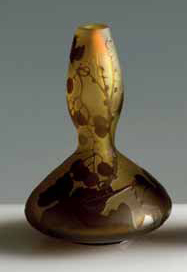Gallé. Piccolo vaso in vetro a cammeo con collo oblungo e decoro a bacche,...