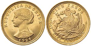 CILE. Repubblica. 100 Pesos 1926. Au (30.5mm, 20.41g). KM 170; Fr. 54. BB