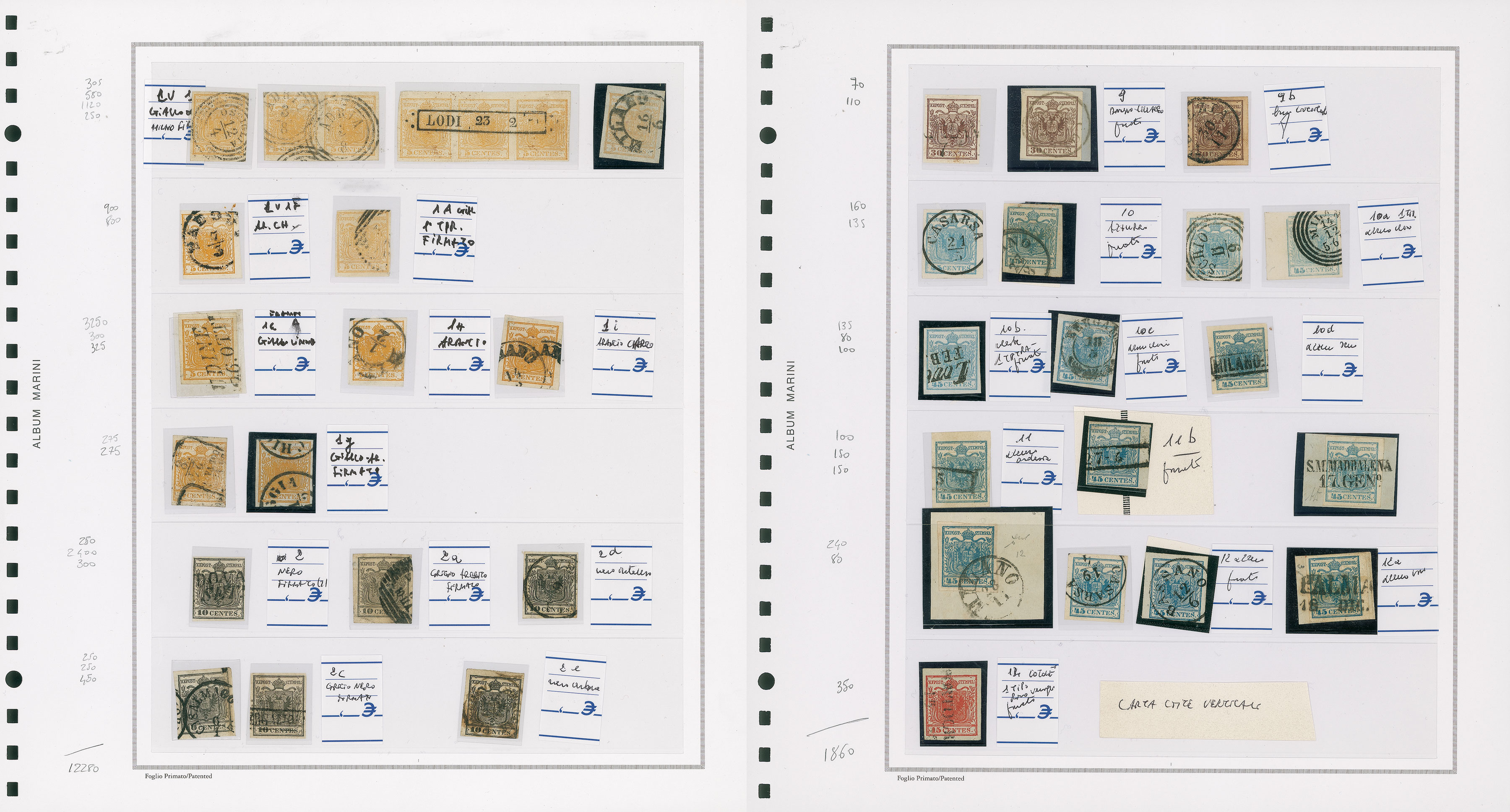LOTTI VOLUMINOSI - LOMBARDO VENETO - 1850/1864 - Collezione specializzata su 10 fogli Primato - 159 pezzi con coppie e striscie - anche valori di Sardegna e usi nel Levante - da esaminare (circa 32.000)