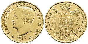 MILANO - Napoleone I, Re d'Italia (1805-1814) - 40 Lire - 1814 - AU Pag. 17a; Mont. 204 Puntali sagomati Segnetti di contatto su stupendi fondi lucenti - FDC