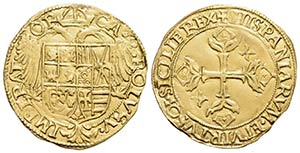 NAPOLI - Carlo V (1516-1556) - Scudo d'oro - Stemma su aquila bicipite - R/ Croce fiorata - (AU g. 3,31) R CNI 211/215; P.R. manca Nel 1° e 4° quarto K - BB-SPL