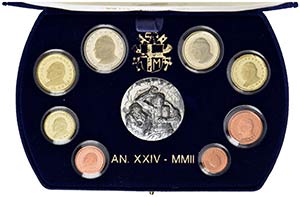 ROMA - Giovanni Paolo II (2002-2005 monetazione in euro) - Serie - 2002 A. XXIV° - Omaggio a Michelangelo - Proof - In scatola originale con medaglia - Stappetto della scatola - FDC
