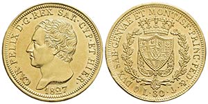 Carlo Felice (1821-1831) - 80 Lire - 1827 G - (AU g. 25,77) Pag. 29; Mont. 10 Colpetto - Fondi lucenti - SPL-FDC