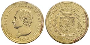 Carlo Felice (1821-1831) - 40 Lire - 1822 T - AU RR Pag. 39; Mont. 21 Periziata Rocco di Torrepadula - BB-SPL