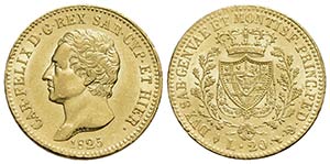 Carlo Felice (1821-1831) - 20 Lire - 1825 T - (AU g. 6,43) Pag. 51; Mont. 35 Bellissimi fondi - qFDC/FDC