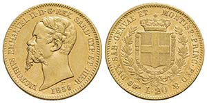 Vittorio Emanuele II (1849-1861) - 20 Lire - 1856 T - (AU g. 6,41) RRR Pag. 349; Mont. 15 - qSPL/SPL