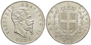 Vittorio Emanuele II Re d'Italia (1861-1878) - 5 Lire - 1876 R - AG R Pag. manca; Mont. manca R del segno di zecca spostata a sinistra Eccezionale - FDC