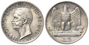 Vittorio Emanuele III (1900-1943). 5 Lire 1932. Ar (23mm, 5.00g). Roma. Pagani 715; Gigante 79. Rarissima, 50 esemplari coniati. qSPL