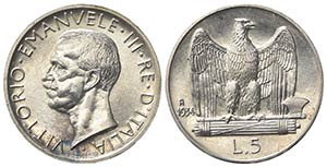 Vittorio Emanuele III (1900-1943). 5 Lire 1934. Ar (23mm, 5.00g). Roma. Pagani 717; Gigante 81. Rarissima, 50 esemplari coniati. SPL