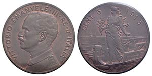 Lotto 306 | Vittorio Emanuele III (1900-1943) - 5 Centesimi - 1913 Prora (senza punto) - CU RR Pag. 895a; Mont. 364 Periziata - Rame rosso - FDC