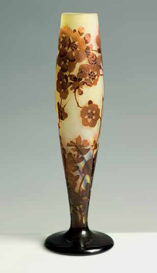 Gallé. Vaso in vetro a cammeo ornato da tralci fioriti amaranto su fondo avorio con sfumature, 1900 circa. Firma a cammeo: Gallé altezza cm 36
