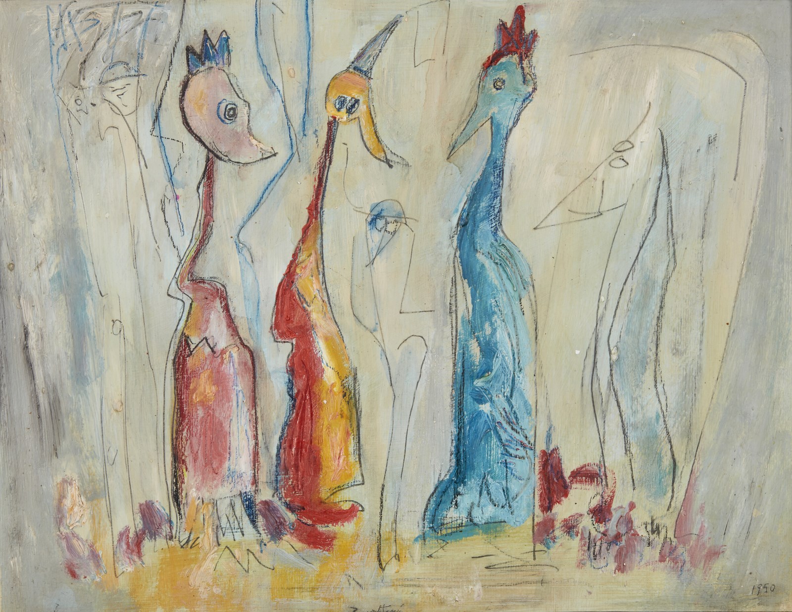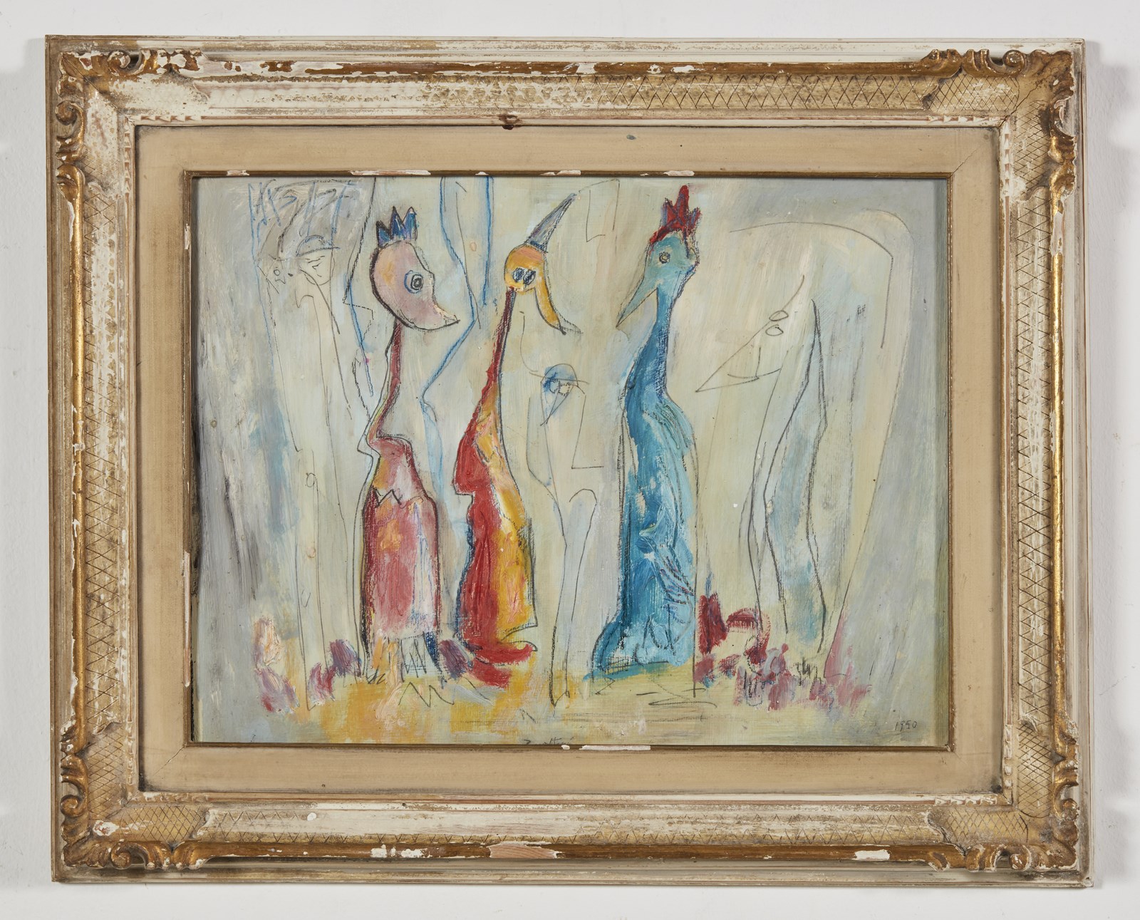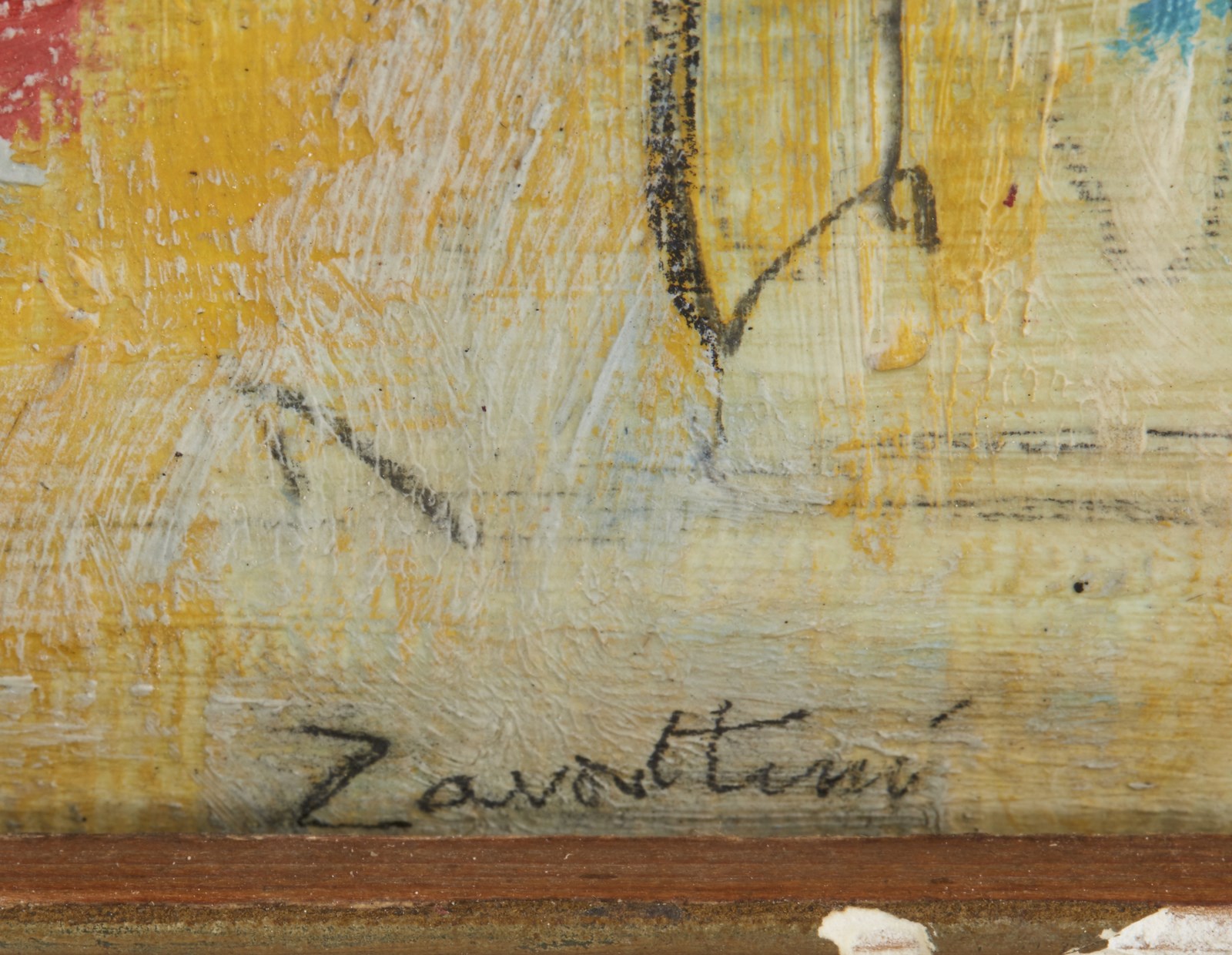 ZAVATTINI CESARE (1902 - 1989) Senza titolo. 1950. Olio su cartone. Cm 40,00 x 30,00. Firma e anno in basso. Difetti. Cornice presente