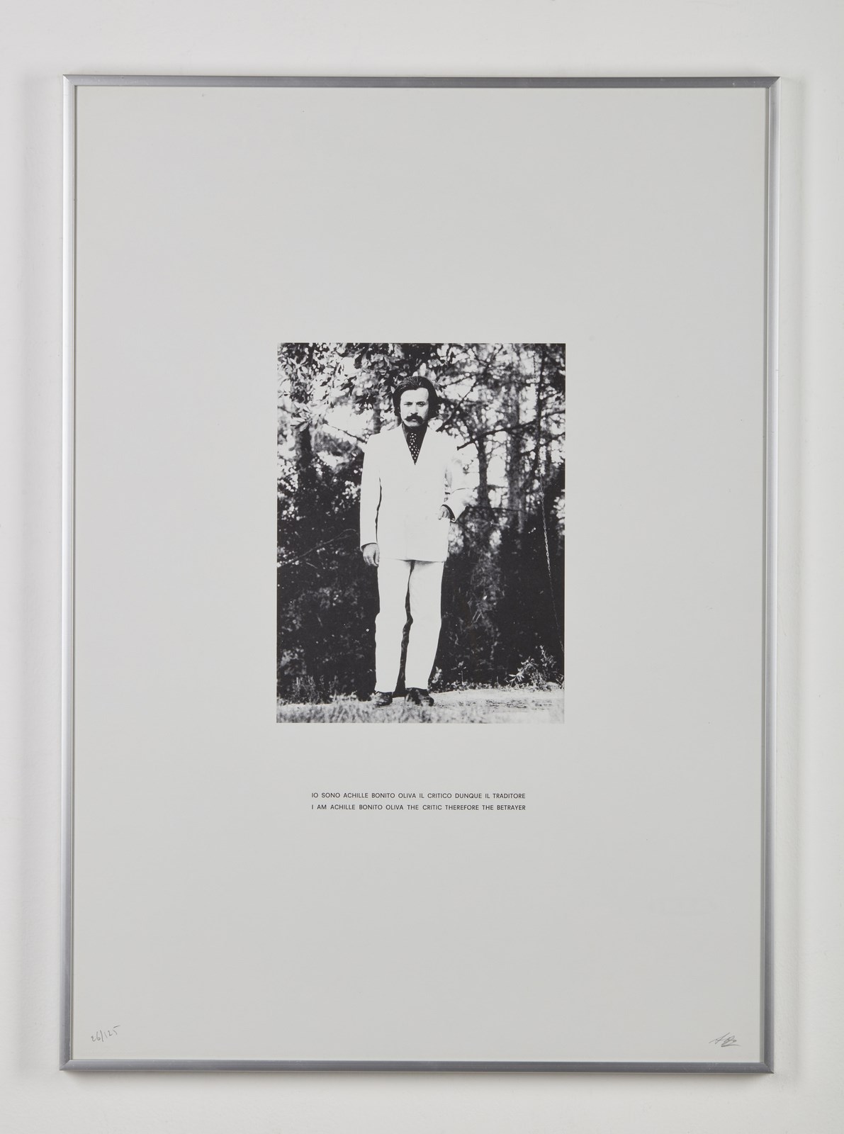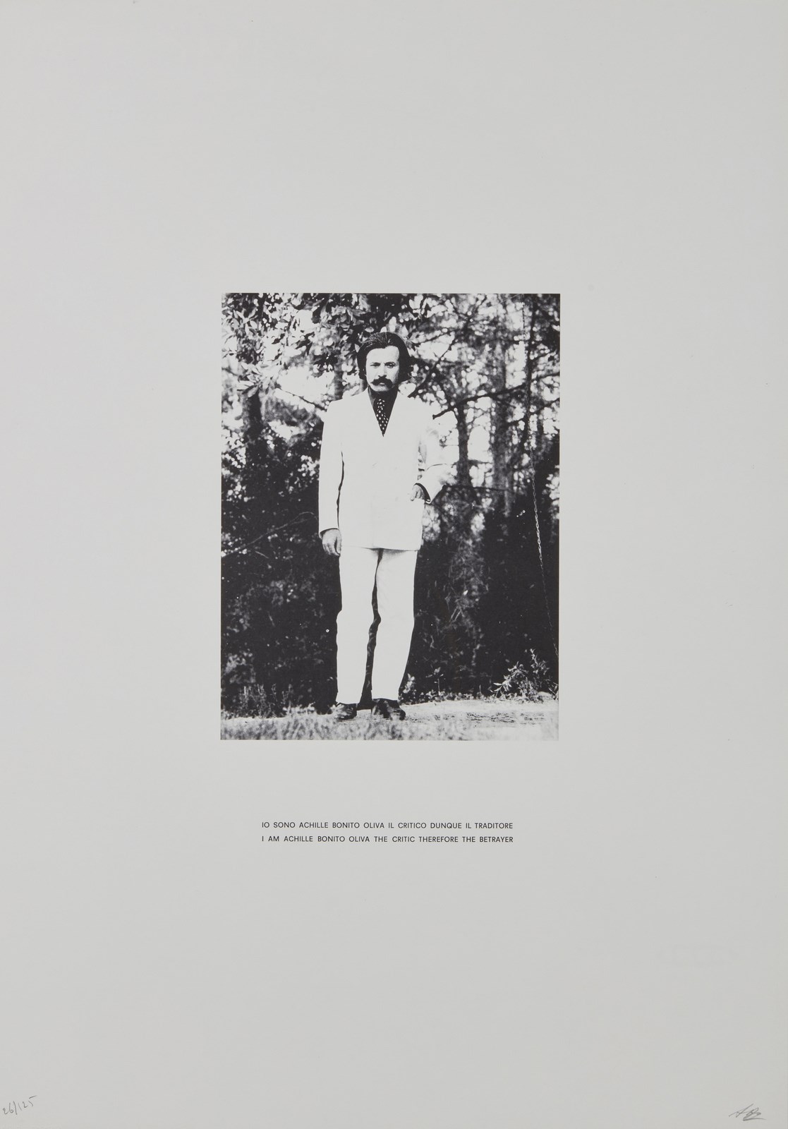 BONITO OLIVA ACHILLE (n. 1939) Io sono Achille Bonito Oliva il critico dunque il traditore. Litografia. Cm 50,00 x 70,00. 26/125. Tiratura e firma in basso a matita. Timbro a secco in basso a sinistra Artestudio, Macerata. Lievi difetti. . Cornice presente