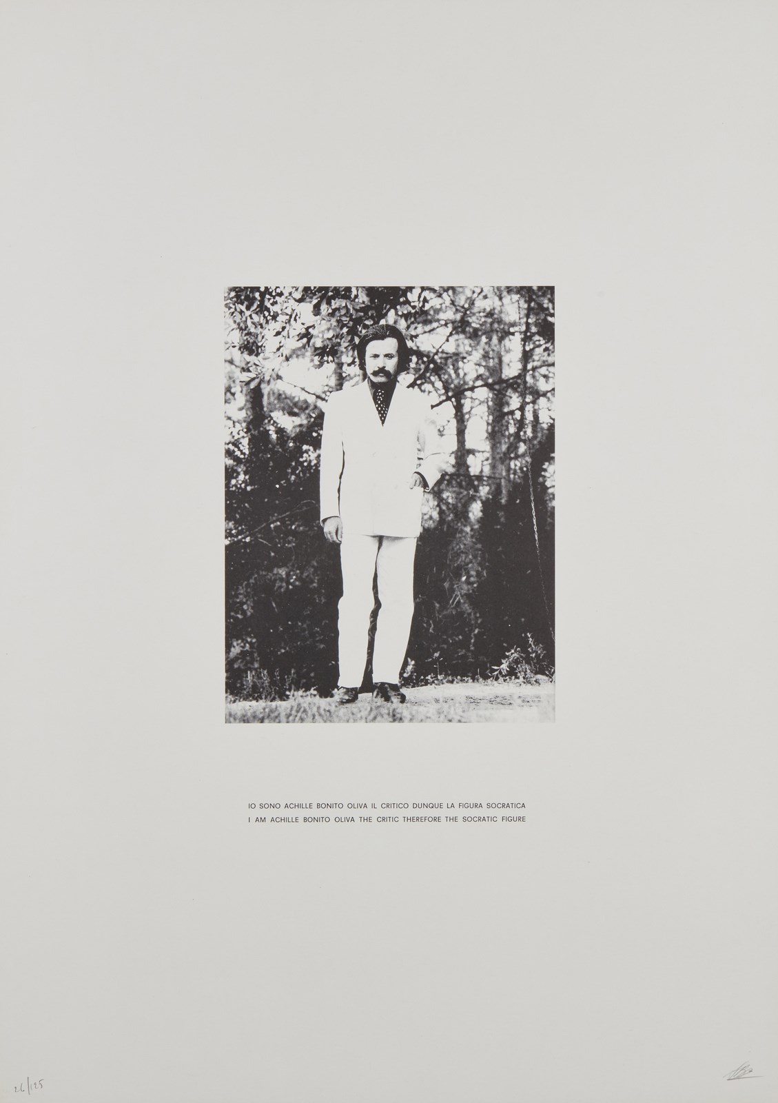 BONITO OLIVA ACHILLE (n. 1939) Io sono Achille Bonito Oliva il critico dunque la figura socratica. Litografia. Cm 50,00 x 70,00. 26/125. Tiratura e firma in basso a matita. Timbro a secco in basso a sinistra Artestudio, Macerata. Lievi difetti. . Cornice presente